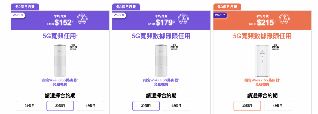 3HK有三個方案,分別是HK$152、HK$179和HK$219,其中HK$152方案,當每月使用的流動數據用量超過500GB,即會變至FUP無限,而HK$179則是5G數據任用。HK$215方案價格最貴,則是Wifi 7及5G數據任用,。