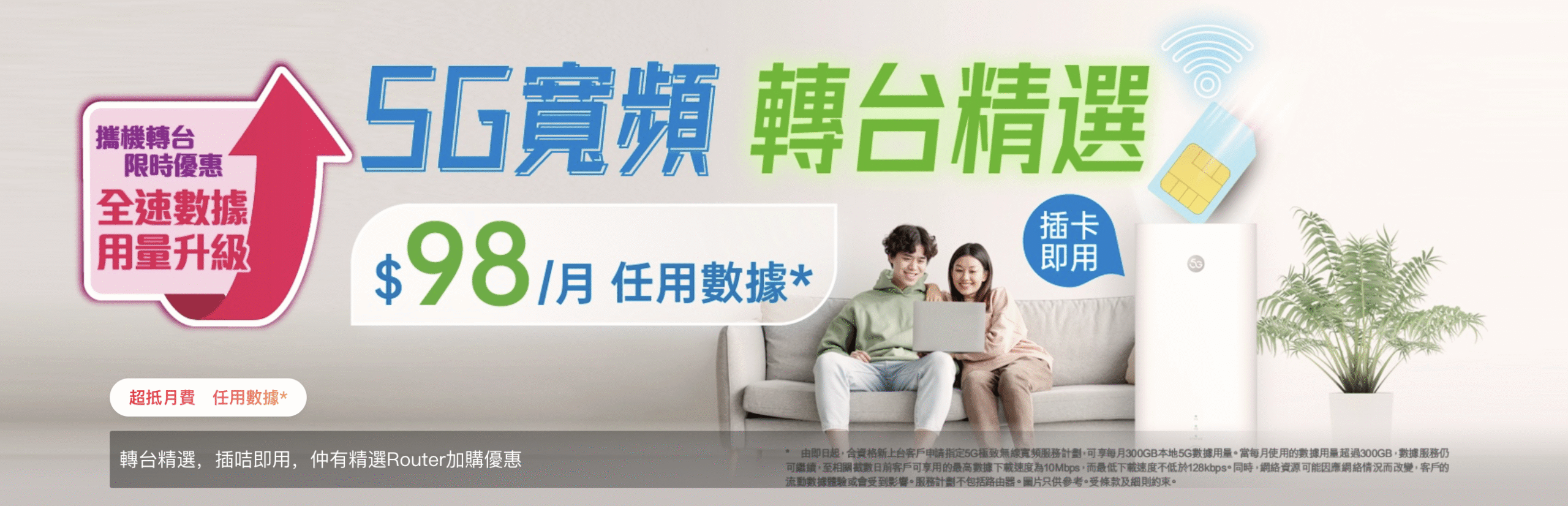 HK$98(30個月)300GB其後任用最高10Mbps豁免